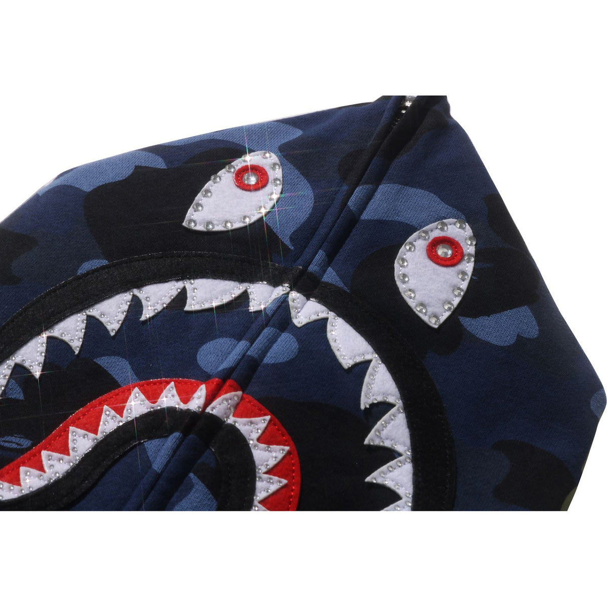 The Color Camo Crystal Stone Shark Cropped Full Zip Hoodie Ladies combines iconic streetwear style with a touch of luxury. Featuring the signature Shark face design and BAPE’s vibrant color camo pattern, it’s elevated with crystal stone embellishments for a sparkling, standout look. Made from premium cotton fleece, this cropped hoodie offers both comfort and edge, perfect for modern street fashion. The full zip closure adds versatility, while the feminine cropped fit delivers a flattering silhouette. Ideal for layering or making a bold solo statement, this hoodie captures the perfect balance of street attitude and high-end style.