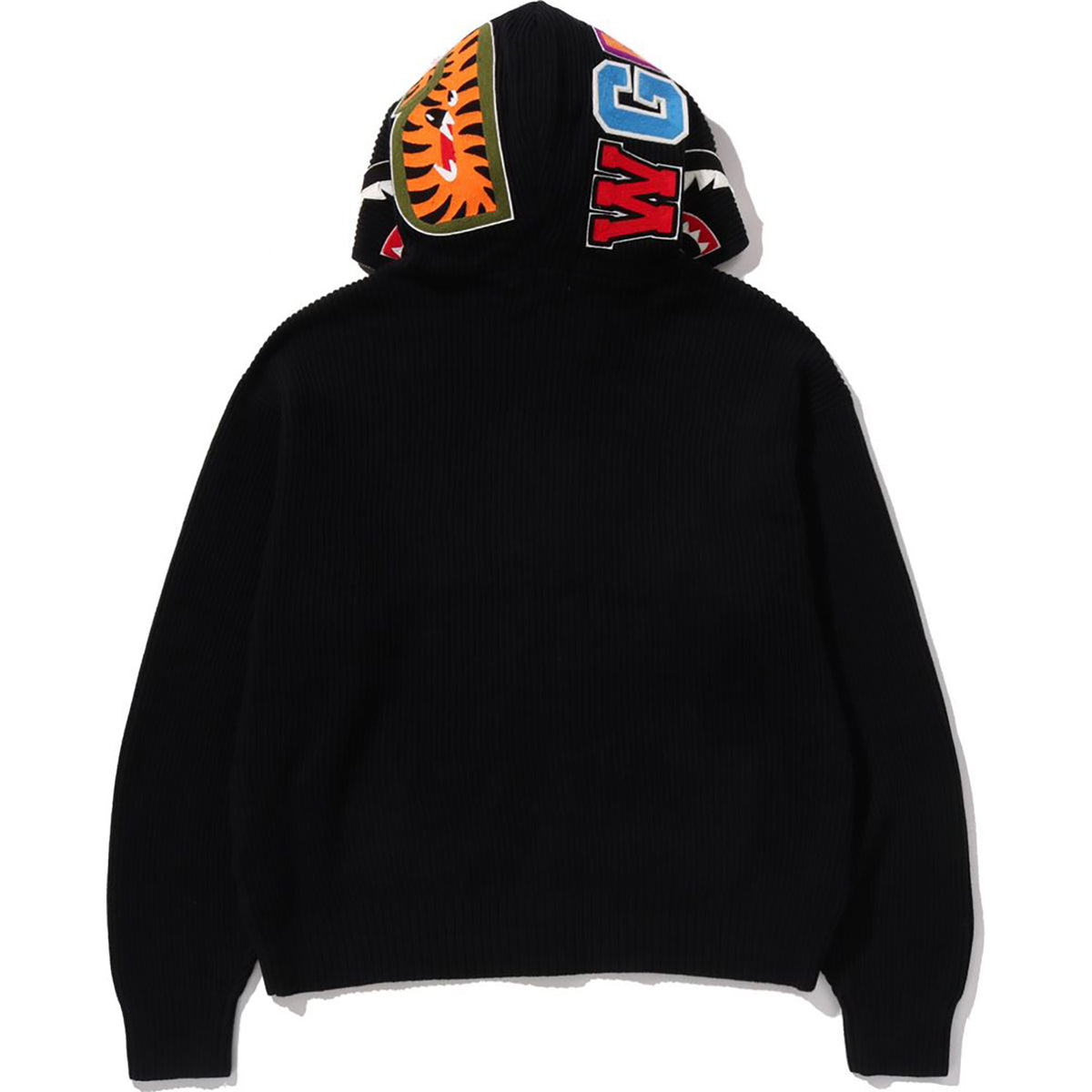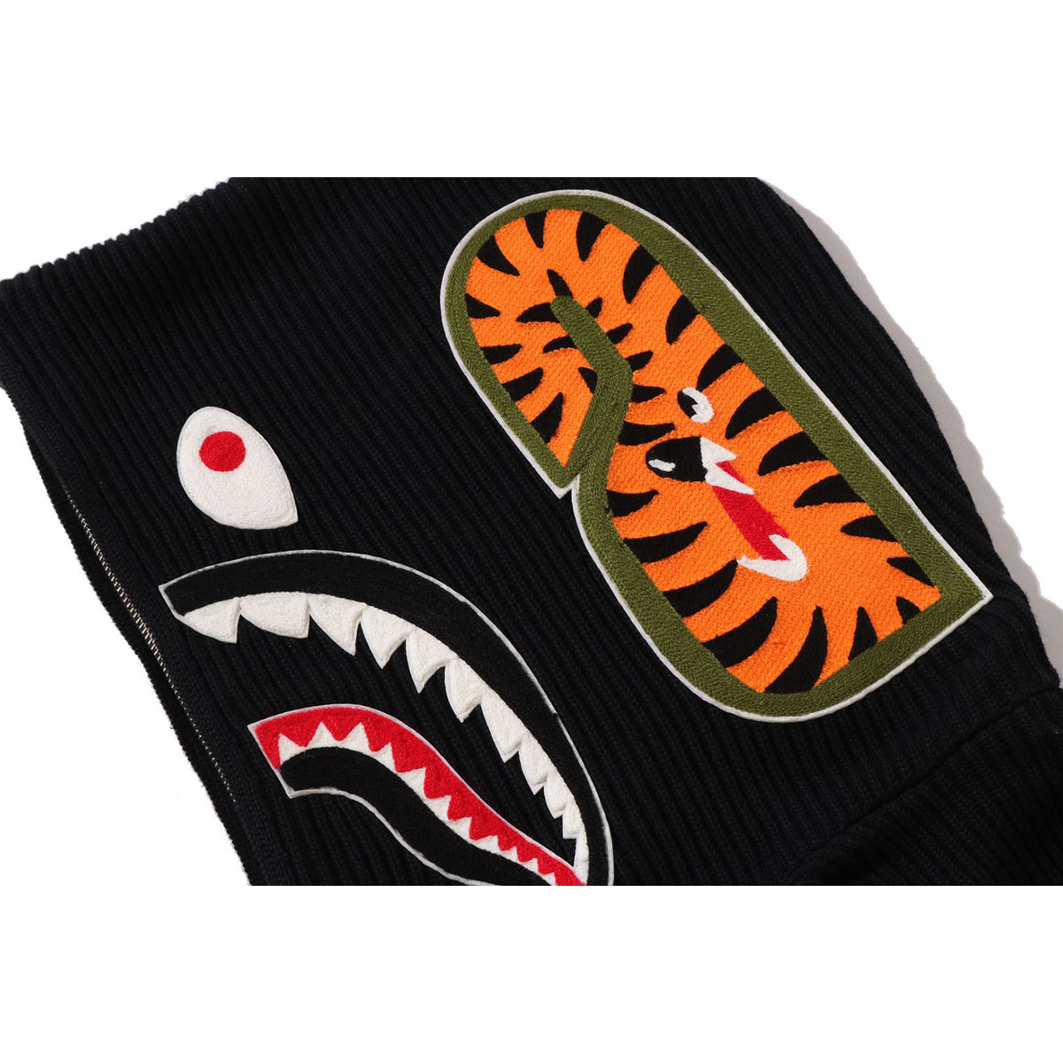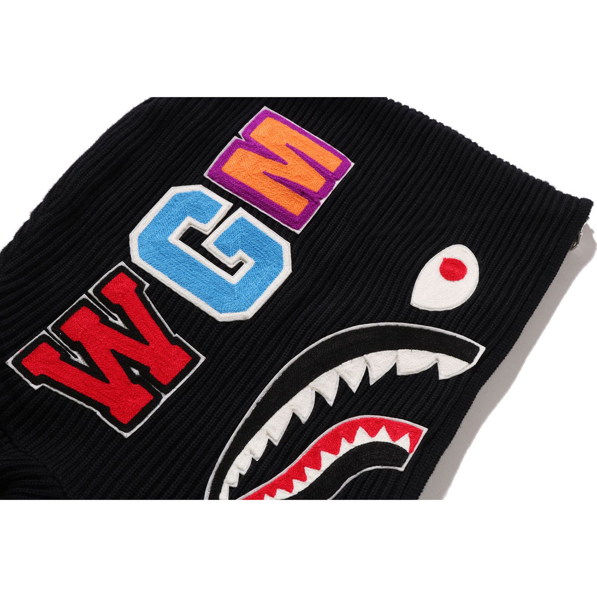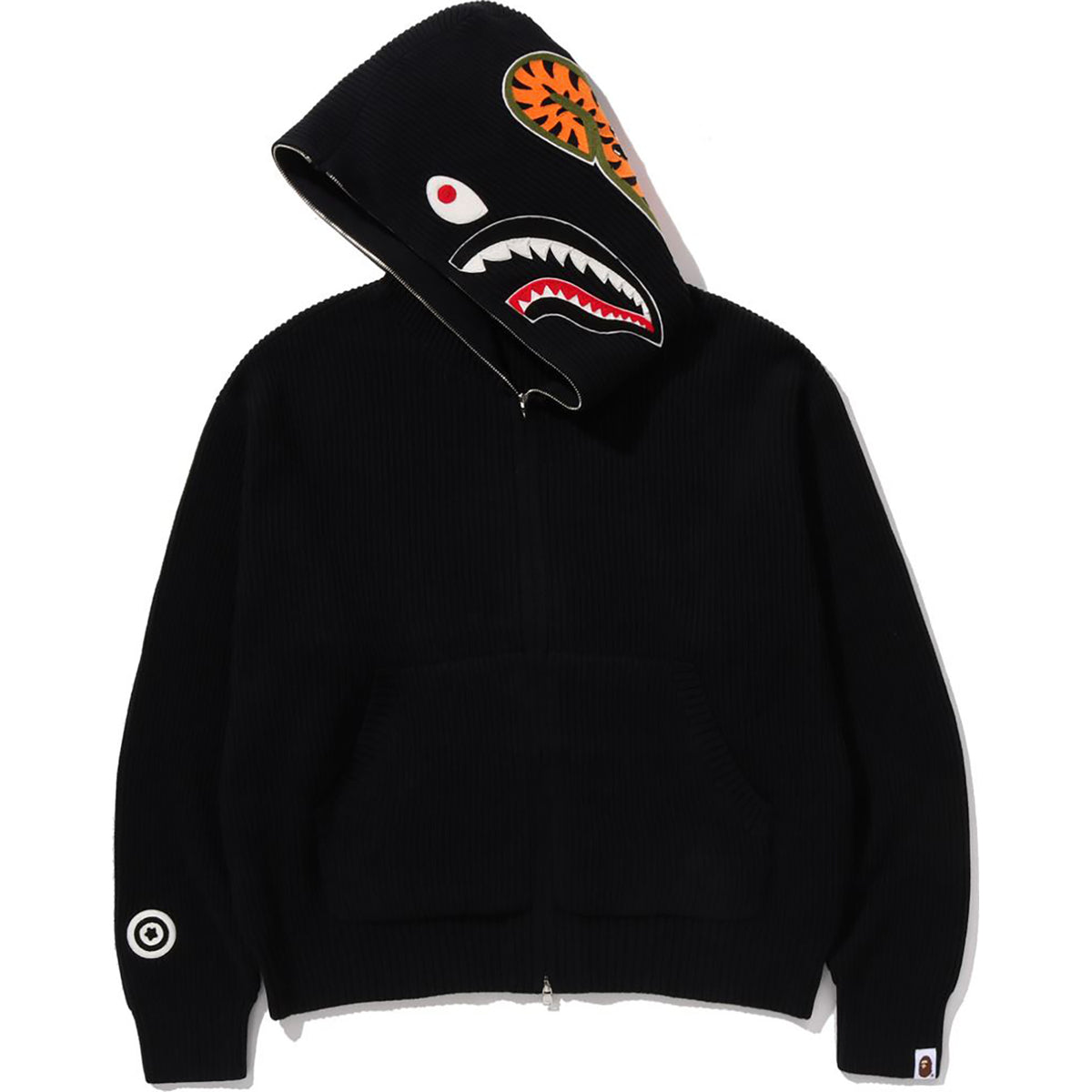 Design: Full-zip knit hoodie with a bold SHARK motif on the hood